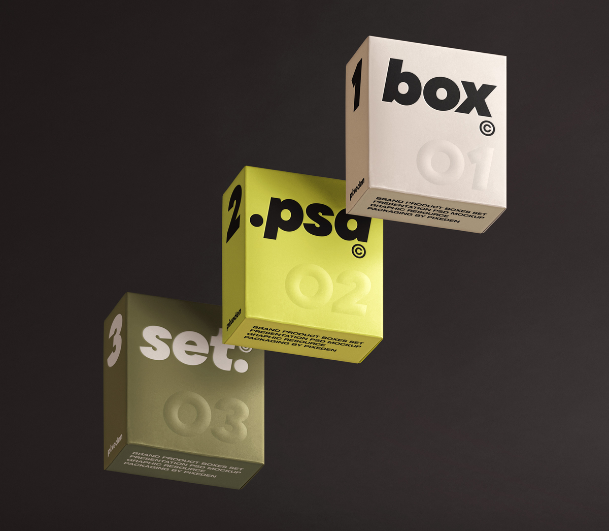 A psd mockup set of branded product boxes for packaging and identity presentations.