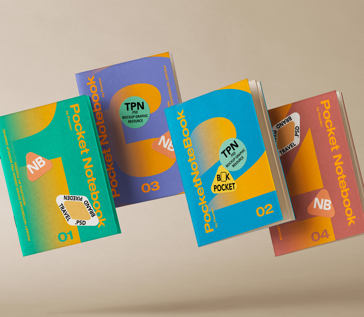 A psd mockup of pocket notebook covers, perfect for stationery identity and branding design displays.